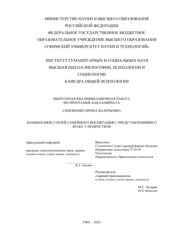 Симоненко, Ирина Валерьевна. Взаимосвязь стилей семейного воспитания с представлениями о браке у подростков: выпускная квалификационная работа по программе бакалавриата. Направление подготовки (специальность) 37.03.01 "Психология". Направленность (профиль) "Практическая психология" / И.В. Симоненко; Уфимский университет науки и технологий, Высшая школа философии, психологии и социологии, ИГСН; Кафедра общей психологии ; научный руководитель М. С. Хухрин. — Уфа, 2025. — 85 с. — <URL:https://elib.bashedu.ru/dl/diplom/2025/Simonenko_IV_P-5PP202Bz_37.03.01_Prakt_Psy_07.2025.pdf>. — Текст: электронный
