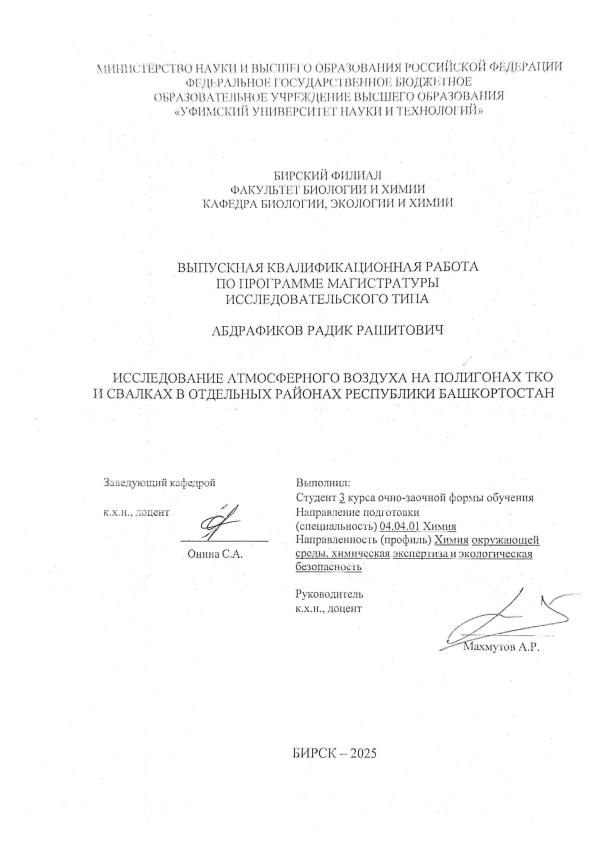 Абдрафиков, Радик Рашитович. Исследование атмосферного воздуха на полигонах ТКО и свалках в отдельных районах Республики Башкортостан: выпускная квалификационная работа магистра по направлению подготовки 04.04.01 «Химия», направленность (профиль) «Химия окружающей среды, химическая экспертиза и экологическая безопасность» / Р. Р. Абдрафиков; Уфимский университет науки и технологий, Бирский филиал ; научный руководитель А. Р. Махмутов. — Бирск, 2025. — 78 с.: ил. — <URL:https://elib.bashedu.ru/dl/diplom/bf/2025/AbdrafikovRR_04.04.01_Ximiya_mag_2025_vkr.pdf>. — Текст: электронный