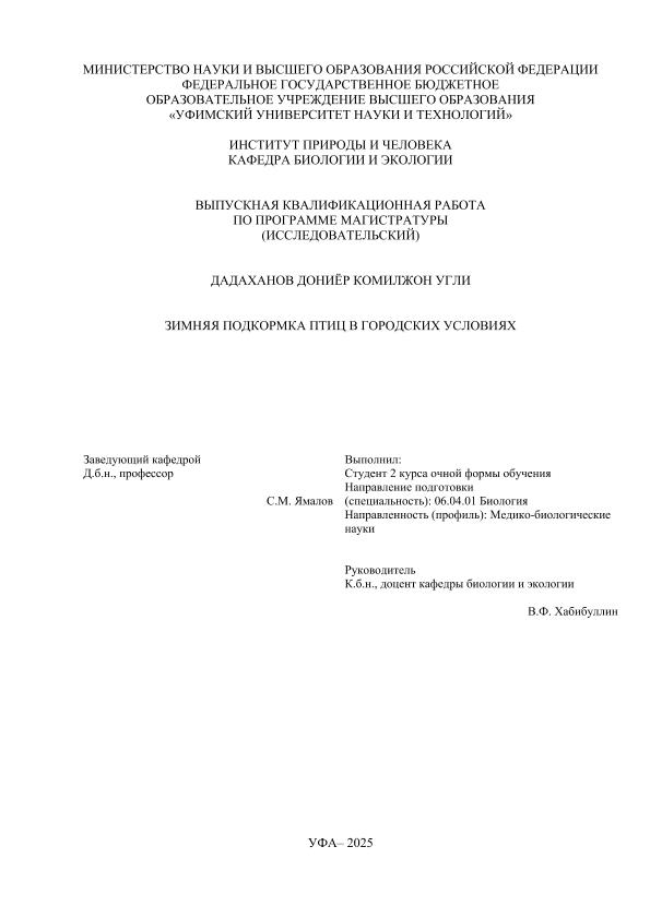 Дадохонов, Дониербек Комилжон Угли. Зимняя подкормка птиц в городских условиях: выпускная квалификационная работа по программе магистратура. Направление подготовки 06.04.01: "Биология". Направленность (профиль): "Медико-биологические науки" / Д. К. Дадохонов; Уфимский университет науки и технологий, Институт природы и человека, Кафедра биологии и экологии; научный руководитель: В. Ф. Хабибуллин. — Уфа, 2025. — 70 с. — <URL:https://elib.bashedu.ru/dl/diplom/2025/Dadahonov_DK_06.04.01_Biologiya.pdf>. — Текст: электронный
