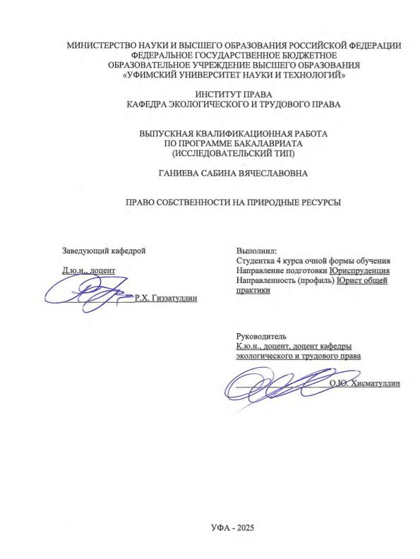 Ганиева, Сабина Вячеславовна. Право собственности на природные ресурсы: выпускная квалификационная работа бакалавра; направление подготовки (специальность) 40.03.01 Юриспруденция; направленность (профиль): Юрист общей практики / С.В. Ганиева; Уфимский университет науки и технологий, Институт права, Кафедра экологического и трудового права; научный руководитель: О. Ю. Хисматуллин. — Уфа, 2025. — 62 с.: ил. — <URL:https://elib.bashedu.ru/dl/diplom/2025/Ganieva_SV_40.03.01_jurisprudence_bak_2025.pdf>. — текст: электронный
