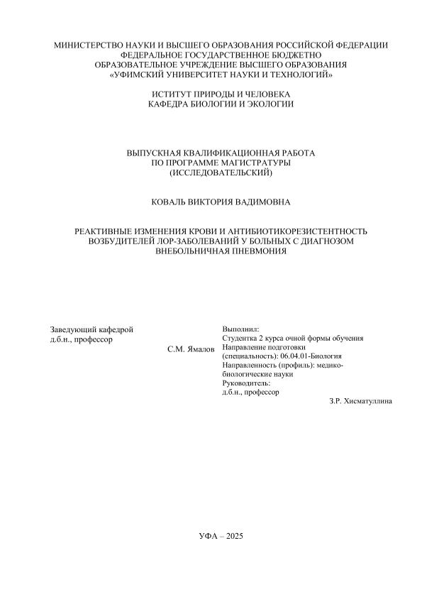 Коваль, Виктория Вадимовна. Реактивные изменения крови и антибиотикорезистентность возбудителей ЛОР-заболеваний у больных с диагнозом внебольничная пневмония: выпускная квалификационная работа по программе магистратура. Направление подготовки 06.04.01: "Биология". Направленность (профиль): "Медико-биологические науки" / В. В. Коваль; Уфимский университет науки и технологий, Институт природы и человека, Кафедра биологии и экологии; научный руководитель: З. Р. Хисматуллина. — Уфа, 2025. — 75 с. — <URL:https://elib.bashedu.ru/dl/diplom/2025/Koval_VV_06.04.01_Biologiya.pdf>. — Текст: электронный