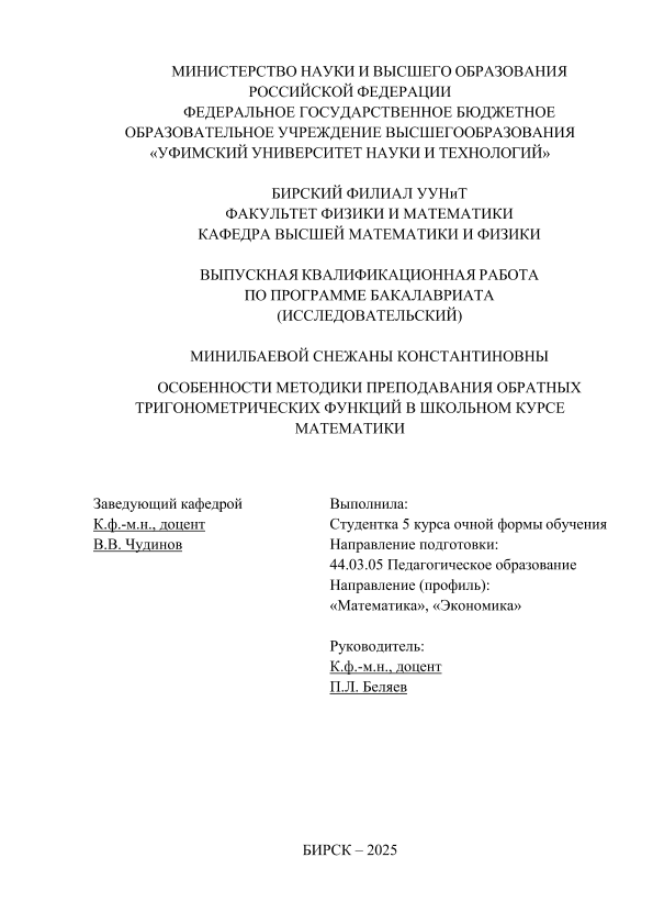 Минилбаева, Снежана Константиновна. Особенности методики преподавания обратных тригонометрических функций в школьном курсе математики: выпускная квалификационная работа по программе бакалавриата. Направление подготовки (специальность): 44.03.05 Педагогическое образование» (с двумя профилями подготовки). Направленность (профили): «Математика», "Экономика" / С. К. Минилбаева; Уфимский университет науки и технологий, Бирский филиал ; научный руководитель П. Л. Беляев. — Бирск, 2025. — 62 с.: ил. — <URL:https://elib.bashedu.ru/dl/diplom/bf/2025/Minilbayeva S.K.44.03.05 PO Matematika, Ekonomika, Bak, 2025.pdf>. — Текст: электронный