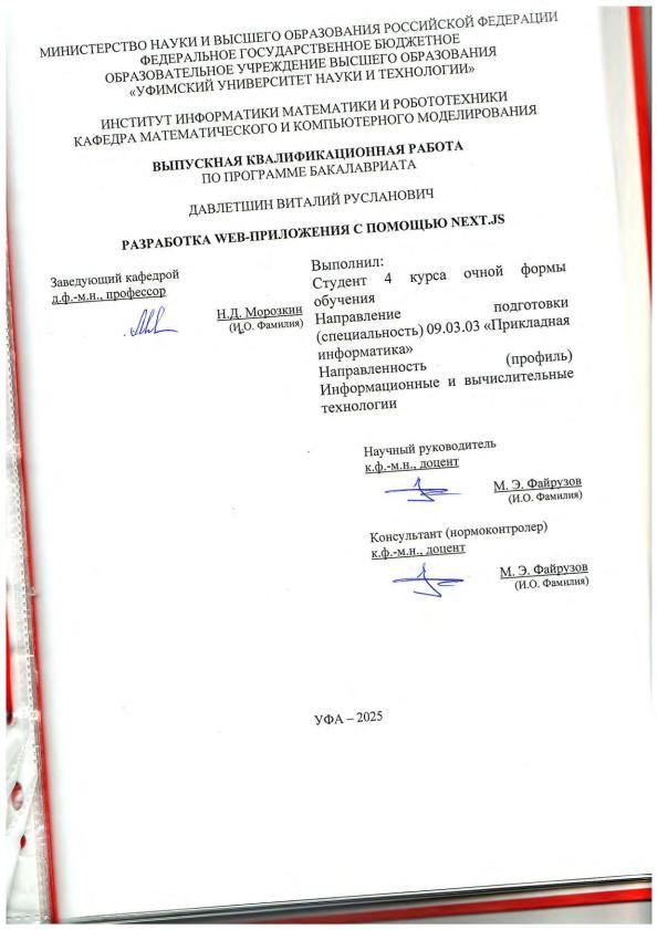 Давлетшин, Виталий Русланович. Разработка web-приложения с помощью Next.js: выпускная квалификационная работа по программе бакалавриата. Направление подготовки 09.03.03 : "Прикладная информатика". Направленность (профиль): "Информационные и вычислительные технологии" / В.Р. Давлетшин; Уфимский университет науки и технологий, Институт информатики, математики и робототехники, Кафедра математического и компьютерного моделирования ; научный руководитель: М.Э. Файрузов. — Уфа, 2025. — 29 с. — <URL:https://elib.bashedu.ru/dl/diplom/2025/Davletshin_V_R_PI-4IVT221B_09_03_03_PI_06_2025.pdf>. — Текст: электронный