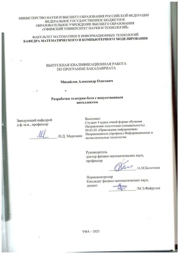 Михайлов, Александр Олегович. Разработка телеграм-бота с искусственным интеллектом: выпускная квалификационная работа по программе бакалавриата. Направление подготовки 09.03.03 : "Прикладная информатика". Направленность (профиль): "Информационные и вычислительные технологии" / А.О. Михайлов; Уфимский университет науки и технологий, Институт информатики, математики и робототехники, Кафедра математического и компьютерного моделирования ; научный руководитель: А.М. Болотнов; нормоконтроль: М.Э. Файрузов. — Уфа, 2025. — 49 с. — <URL:https://elib.bashedu.ru/dl/diplom/2025/Mikhaylov_A_O_PI-4IVT221B_09_03_03_PI_06_2025.pdf>. — Текст: электронный