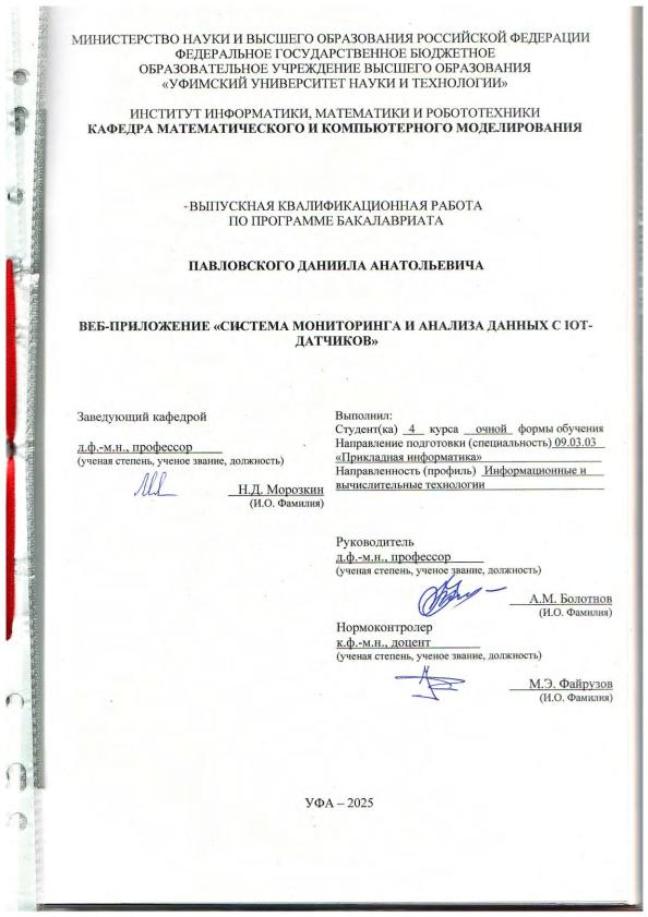 Павловский, Даниил Анатольевич. Веб-приложение "Система мониторинга и анализа данных с IoT-датчиков": выпускная квалификационная работа по программе бакалавриата. Направление подготовки 09.03.03 : "Прикладная информатика". Направленность (профиль): "Информационные и вычислительные технологии" / Д.А. Павловский; Уфимский университет науки и технологий, Институт информатики, математики и робототехники, Кафедра математического и компьютерного моделирования ; научный руководитель: А.М. Болотнов; нормоконтроль: М.Э. Файрузов. — Уфа, 2025. — 64 с. — <URL:https://elib.bashedu.ru/dl/diplom/2025/Pavlovskiy_D_A_PI-4IVT221B_09_03_03_PI_06_2025.pdf>. — Текст: электронный