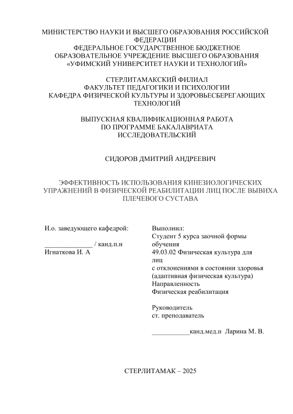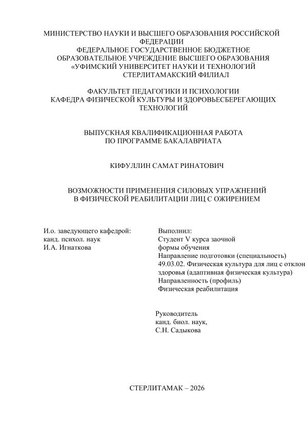 физическая культура). Программа: Физическая реабилитация / Р. Ш. Кашапова; Уфимский университет науки и технологий, Стерлитамакский филиал, Факультет педагогики и психологии, Кафедра физической культуры и здоровьесберегающих технологий, научный руководитель С. В. Крылова. — Стерлитамак, 2026. — 49 с. — <URL:https://elib.bashedu.ru/dl/diplom/SF/2026/FPIP/KashapovaRSh_49_03_02_ZSAFK52_bak_2026_VKR.pdf>. — текст: электронный