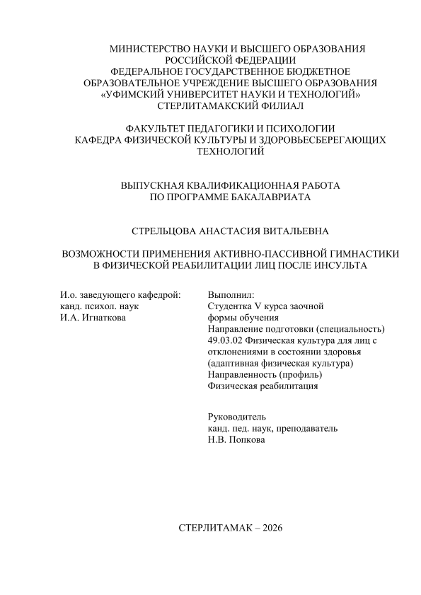 физическая культура). Программа: Физическая реабилитация / Э. А. Сафиуллина; Уфимский университет науки и технологий, Стерлитамакский филиал, Факультет педагогики и психологии, Кафедра физической культуры и здоровьесберегающих технологий, научный руководитель Н. В. Попкова. — Стерлитамак, 2026. — 46 с. — <URL:https://elib.bashedu.ru/dl/diplom/SF/2026/FPIP/SafiullinaEA_49_03_02_ZSAFK52_bak_2026_VKR.pdf>. — текст: электронный