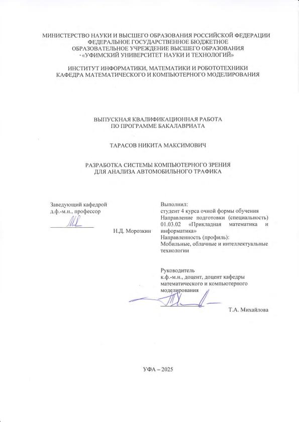 Тарасов, Никита Максимович. Разработка системы компьютерного зрения для анализа автомобильного трафика: выпускная квалификационная работа по программе бакалавриата. Направление подготовки 01.03.02 : "Прикладная математика и информатика". Направленность (профиль): "Мобильные, облачные и интеллектуальные технологии" / Н.М. Тарасов; Уфимский университет науки и технологий, Институт информатики, математики и робототехники, Кафедра математического и компьютерного моделирования ; научный руководитель Т.А. Михайлова;. — Уфа, 2025. — 47 с. — <URL:https://elib.bashedu.ru/dl/diplom/2025/Tarasov_N_M_PMI-4MOIT211B_01_03_02_PMI_06_2025.pdf>. — Текст: электронный