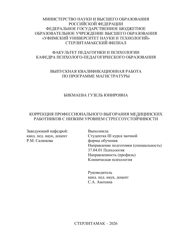 Клиническая психология / Г. Ю. Бикмаева; Уфимский университет науки и технологий, Стерлитамакский филиал, Факультет педагогики и психологии, Кафедра психолого-педагогического образования, научный руководитель С. А. Анохина. — Стерлитамак, 2026. — 103 с. — <URL:https://elib.bashedu.ru/dl/diplom/SF/2026/FPIP/BikmaevaGYu_37_04_01_OZMKP_mag_2026_VKR.pdf>. — текст: электронный