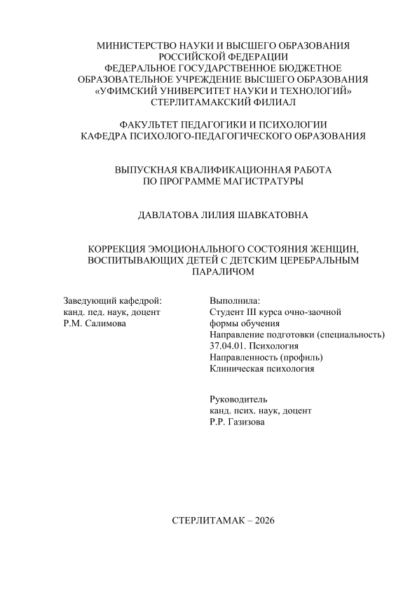 Клиническая психология / Л. Ш. Давлатова; Уфимский университет науки и технологий, Стерлитамакский филиал, Факультет педагогики и психологии, Кафедра психолого-педагогического образования, научный руководитель Газизова. — Стерлитамак, 2026. — 63 с. — <URL:https://elib.bashedu.ru/dl/diplom/SF/2026/FPIP/DavlatovaLSh_37_04_01_OZMKP_mag_2026_VKR.pdf>. — текст: электронный