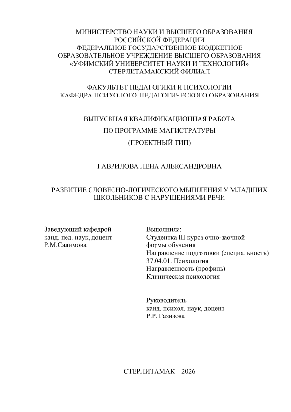 Клиническая психология / Л. А. Гаврилова; Уфимский университет науки и технологий, Стерлитамакский филиал, Факультет педагогики и психологии, Кафедра психолого-педагогического образования, научный руководитель Р. Р. Газизова. — Стерлитамак, 2026. — 67 с. — <URL:https://elib.bashedu.ru/dl/diplom/SF/2026/FPIP/GavrilovaLA_37_04_01_OZMKP_mag_2026_VKR.pdf>. — текст: электронный