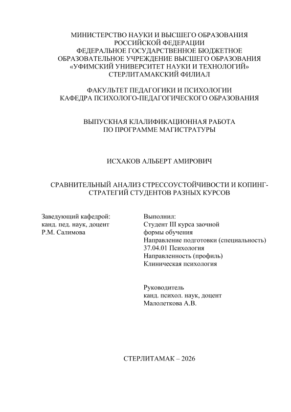 Клиническая психология / А. А. Исхаков; Уфимский университет науки и технологий, Стерлитамакский филиал, Факультет педагогики и психологии, Кафедра психолого-педагогического образования, научный руководитель А. В. Малолеткова. — Стерлитамак, 2026. — 69 с. — <URL:https://elib.bashedu.ru/dl/diplom/SF/2026/FPIP/IskhakovAA_37_04_01_OZMKP_mag_2026_VKR.pdf>. — текст: электронный