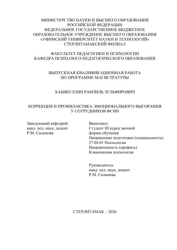 Клиническая психология / Р. З. Хабибуллин; Уфимский университет науки и технологий, Стерлитамакский филиал, Факультет педагогики и психологии, Кафедра психолого-педагогического образования, научный руководитель Р. М. Салимова. — Стерлитамак, 2026. — 76 с. — <URL:https://elib.bashedu.ru/dl/diplom/SF/2026/FPIP/KhabibullinRZ_37_04_01_OZMKP_mag_2026_VKR.pdf>. — текст: электронный
