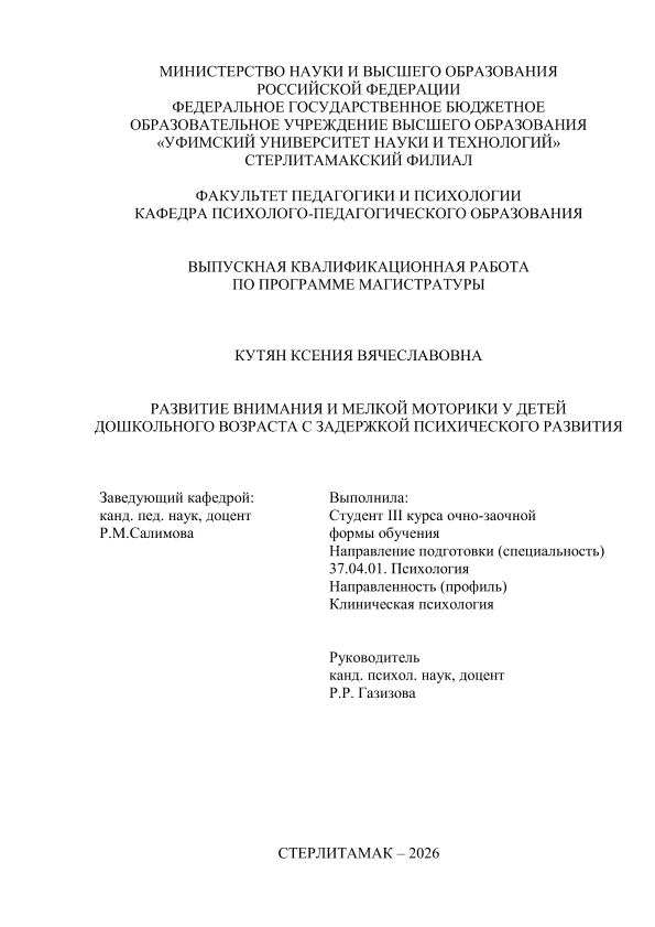 Клиническая психология / А. Р. Кутян; Уфимский университет науки и технологий, Стерлитамакский филиал, Факультет педагогики и психологии, Кафедра психолого-педагогического образования, научный руководитель Р. Р. Газизова. — Стерлитамак, 2026. — 68 с. — <URL:https://elib.bashedu.ru/dl/diplom/SF/2026/FPIP/KutyanKV_37_04_01_OZMKP_mag_2026_VKR.pdf>. — текст: электронный