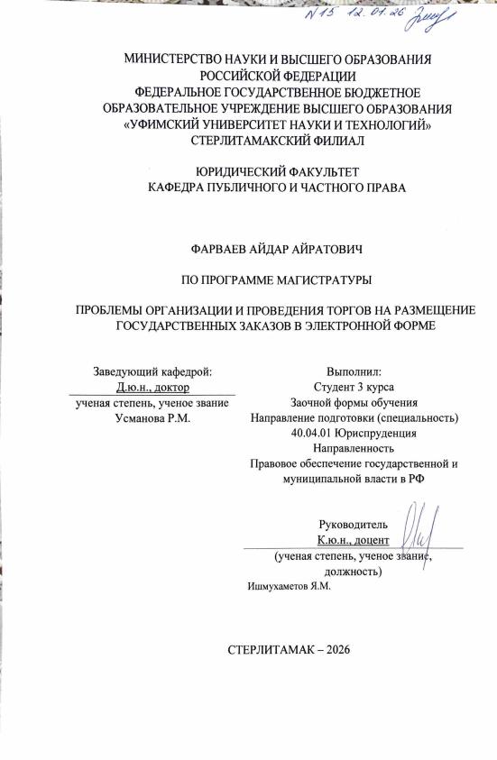 Фарваев, Айдар Айратович. Проблемы организации и проведения торгов на размещение государственных заказов в электронной форме [Электронный ресурс]: выпускная квалификационная работа магистра по направлению подготовки: 40.04.01 Юриспруденция. Направленность: Правовое обеспечение государственной и муниципальной власти в РФ / А. А. Фарваев; Уфимский университет науки и технологий, Стерлитамакский филиал, Юридический факультет, Кафедра публичного и частного права, научный руководитель Я. М. Ишмухаметов. — Стерлитамак, 2026. — 64 с. — <URL:https://elib.bashedu.ru/dl/diplom/SF/2026/UF/FarvaevAA_40.04.01_40_04_01_ZPOGMV_mag_2026_VKR.pdf>. — текст: электронный