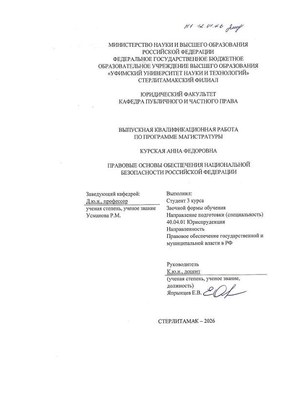 Российской Федерации [Электронный ресурс]: выпускная квалификационная работа магистра по направлению подготовки: 40.04.01 Юриспруденция. Направленность: Правовое обеспечение государственной и муниципальной власти в РФ / А. Ф. Курская; Уфимский университет науки и технологий, Стерлитамакский филиал, Юридический факультет, Кафедра публичного и частного права, научный руководитель Е. В. Япрынцев. — Стерлитамак, 2026. — 87 с. — <URL:https://elib.bashedu.ru/dl/diplom/SF/2026/UF/KurskayaAF_40_04_01_ZPOGMV_mag_2026_VKR.pdf>. — текст: электронный