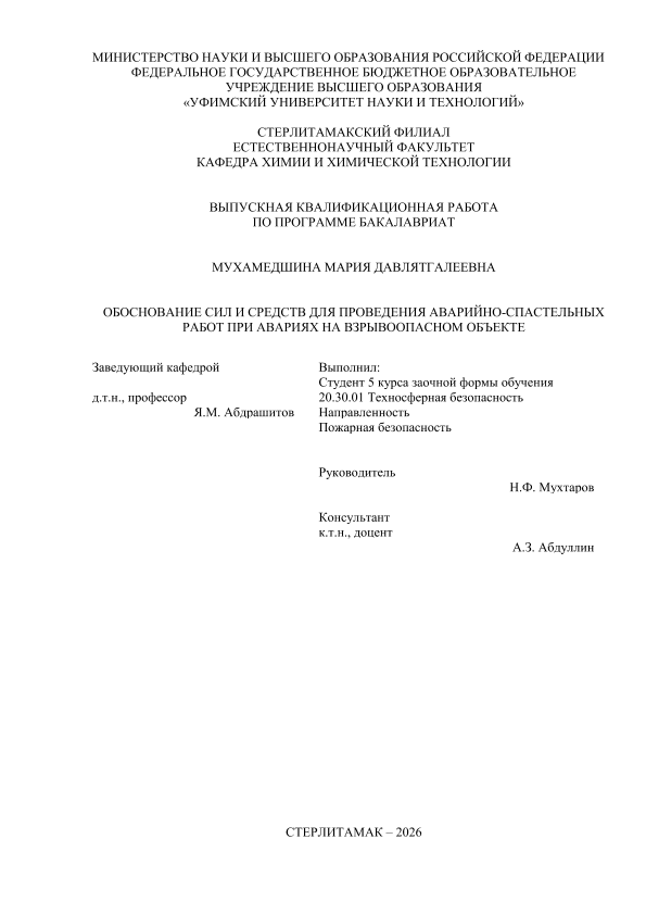 Пожарная безопасность; бакалавриат; ВКР; аварии на взрывоопасном объекте