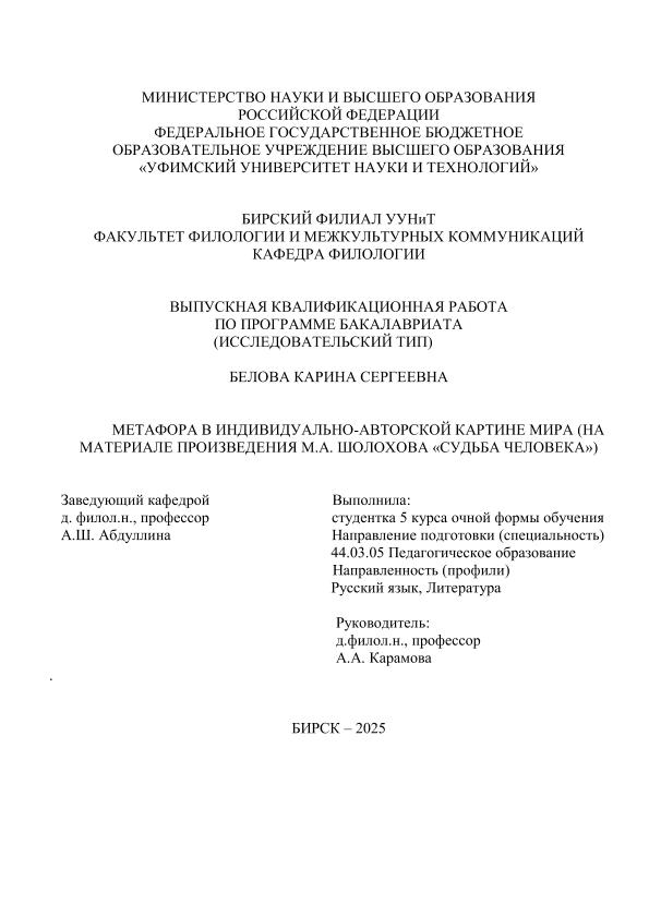 Литературоведение — Поэтика; ВКР; бакалавриат; метафоры; индивидуально-авторская картина мира; русская литература; русские писатели; повести; Шолохов М. А.; Судьба человека; анализ литературного произведения