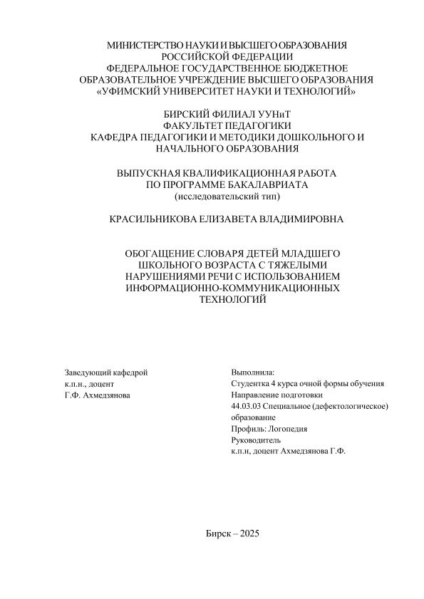 Образование. Педагогика — Дефектология. Специальные школы; ВКР; бакалавриат; младший школьный возраст; информационно-коммуникационные технологии; коммуникативные способности; ОНР; общее недоразвитие речи