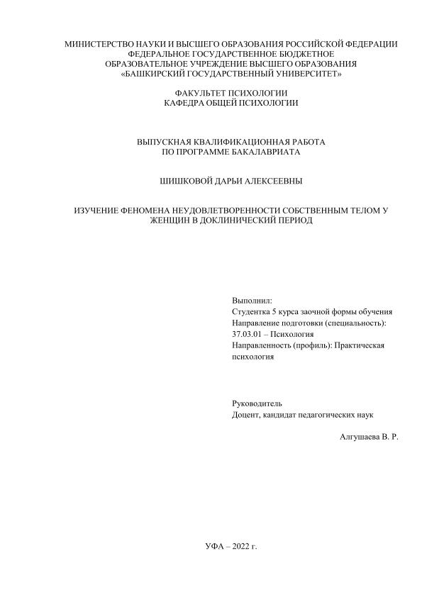 Психология — Медицинская психология (Клиническая психология); ВКР; бакалавриат; неудовлетворенность собственным телом; женщины в доклинический период; пищевое поведение; копинг-стратегии