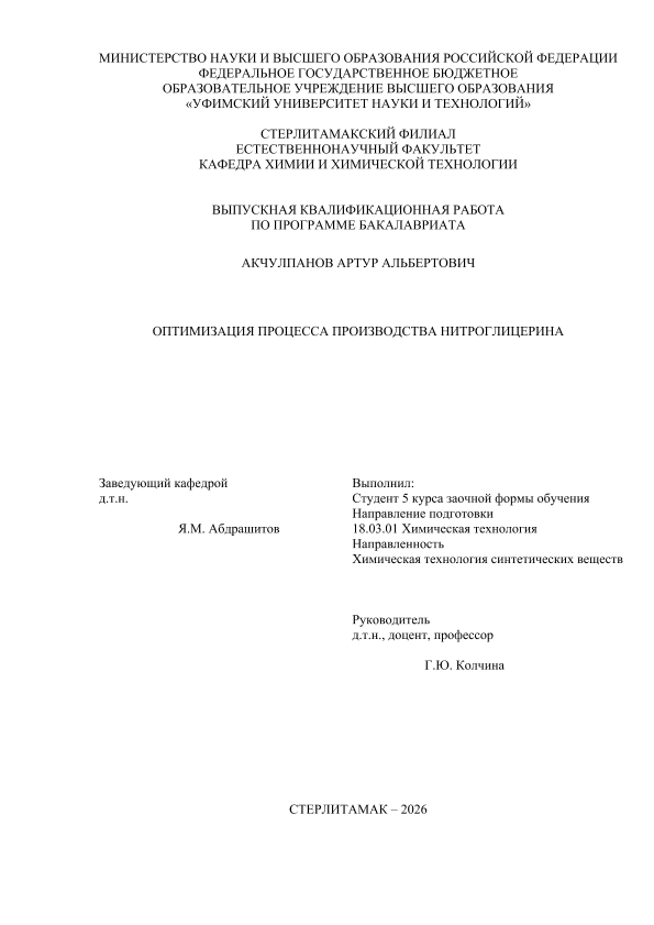 Химическая технология; бакалавриат; ВКР; нитроглицерин