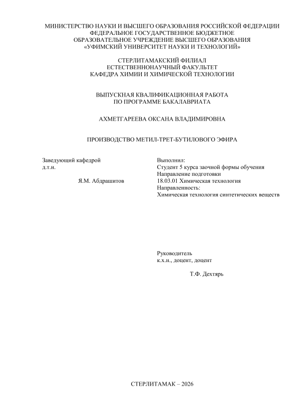 Химическая технология; бакалавриат; ВКР; метил-трет-бутиловый эфир