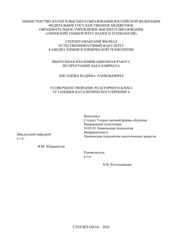 Химическая технология; бакалавриат; ВКР; каталитический крекинг