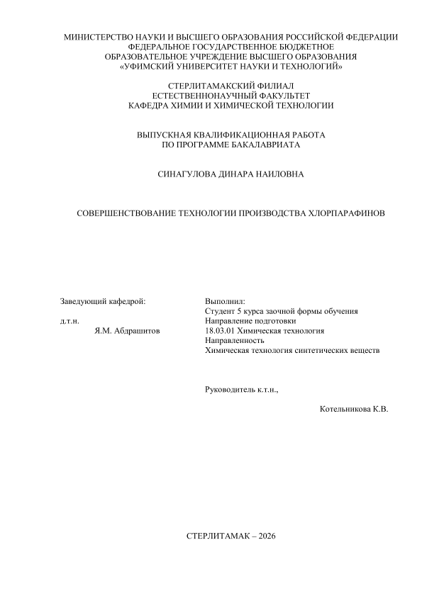 Химическая технология; бакалавриат; ВКР; хлорпарафины