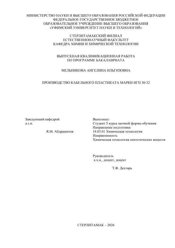 Химическая технология; бакалавриат; ВКР; кабельный пластикат марки НГП 30-32