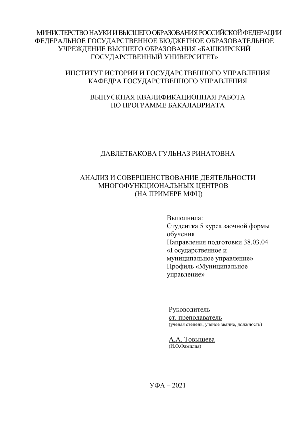 Экономика — Управление экономикой; ВКР; бакалавриат; деятельность многофункционального центра; МФЦ Республики Башкортостан; нормативно-правовые основы; совершенствование работы МФЦ