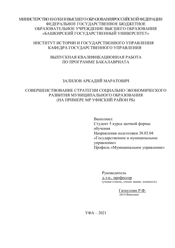 Экономика — Управление экономикой; ВКР; бакалавриат; муниципальное образование; социально-экономическое развитие; Уфимский район РБ; стратегия развития