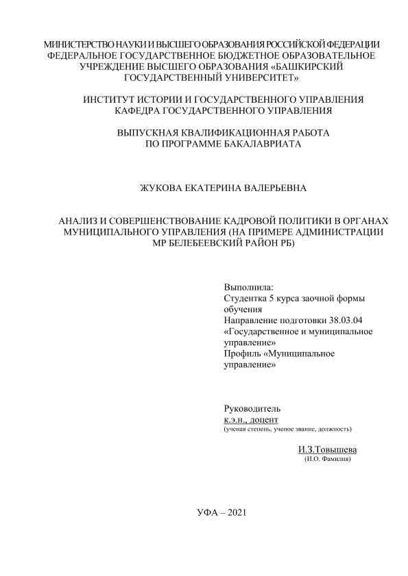 Экономика — Управление экономикой; ВКР; бакалавриат; органы местного самоуправления; кадровая политика; Белебеевский район РБ; планирование кадровой деятельности