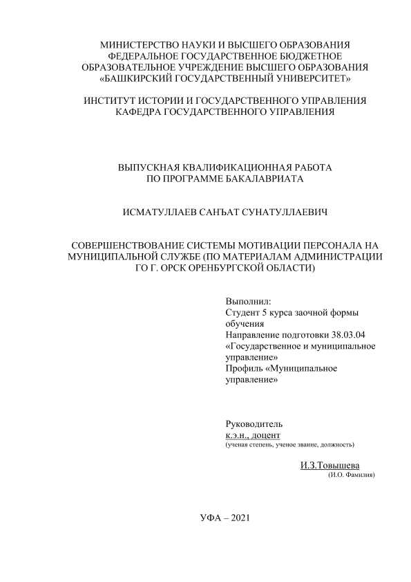 Экономика — Управление экономикой; ВКР; бакалавриат; муниципальная служба; кадровая политика; Администрация г. Орска; системы мотивации муниципального служащего