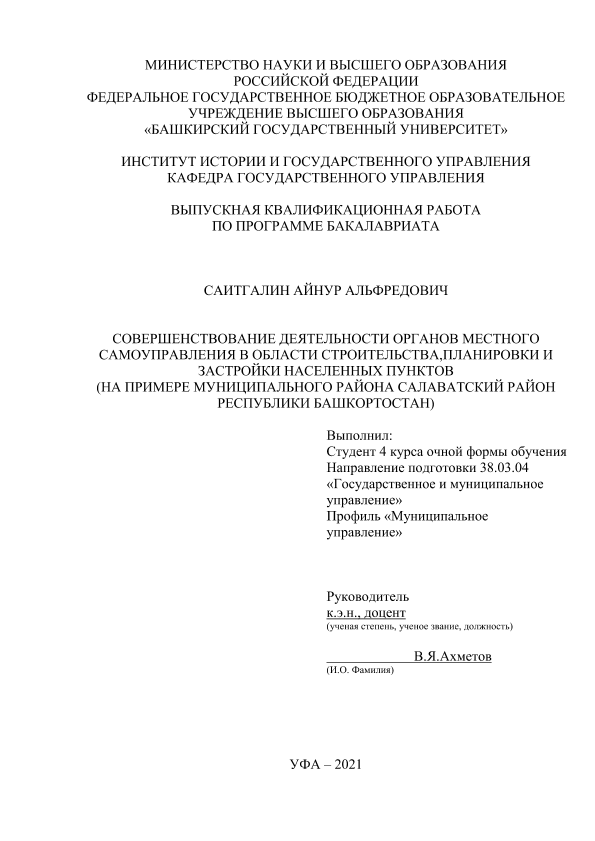 Экономика — Управление экономикой; ВКР; бакалавриат; местное самоуправление; строительство; планировка; застройка; благоустройство территорий