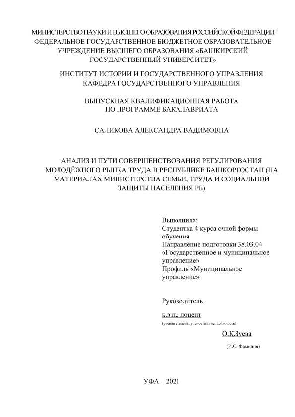 Экономика — Управление экономикой; ВКР; бакалавриат; молодежь; рынок труда; регулирование; нормативно-правовые основы