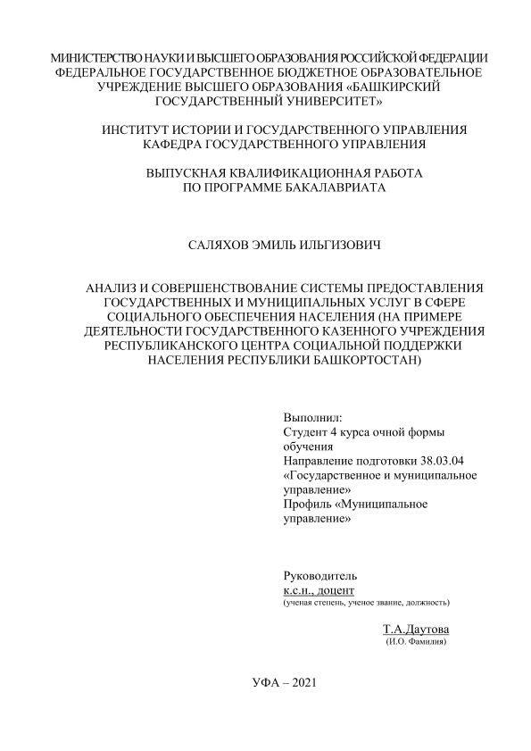 Экономика — Управление экономикой; ВКР; бакалавриат; государственные услуги; муниципальные услуги; социальное обеспечение; нормативно-правовые основы