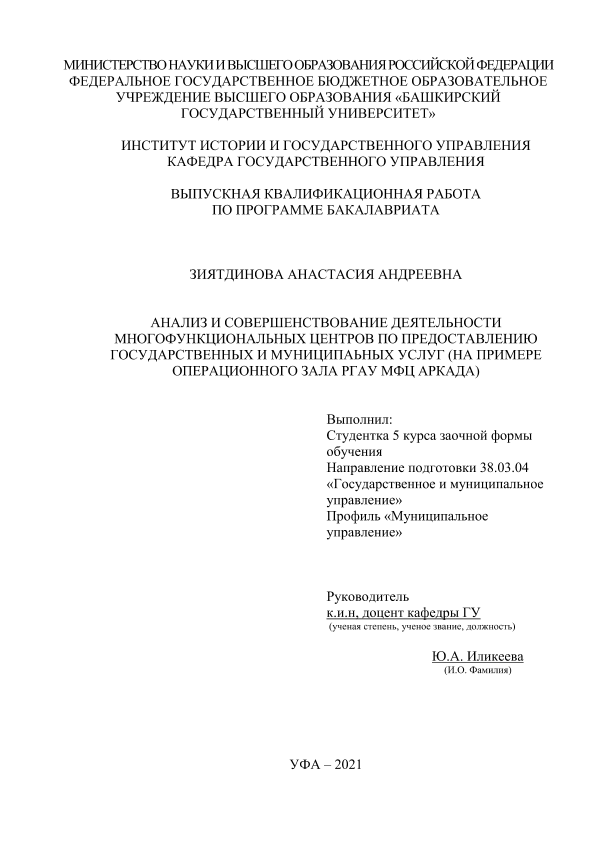 Экономика — Управление экономикой; ВКР; бакалавриат; муниципальные услуги; деятельность многофункциональных центров; Операционный зал РГАУ МФЦ Аркада; нормативно-правовые основы деятельности