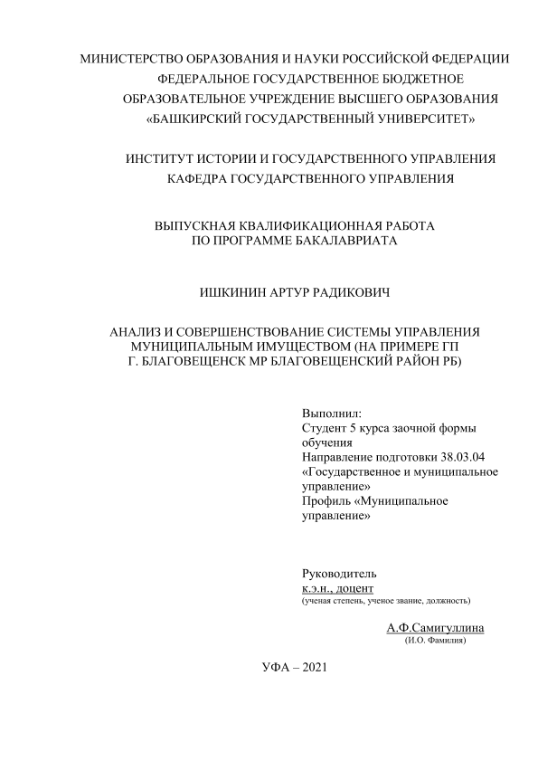 Экономика — Управление экономикой; ВКР; бакалавриат; управление муниципальным имуществом; анализ системы управления; Благовещенский район РБ; социально-экономическое развитие
