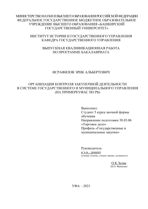 Экономика — Управление экономикой; ВКР; бакалавриат; контроль закупочной деятельности; муниципальные управления; деятельность УФАС; нормативно-правовые основы