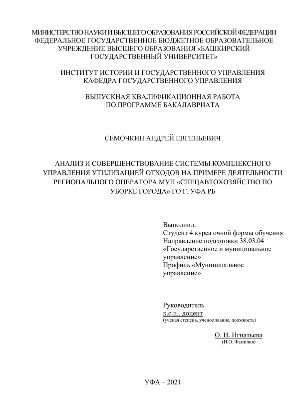 Экономика — Управление экономикой; ВКР; бакалавриат; муниципальные унитарные предприятия; утилизация отходов; нормативно-правовые основы; зарубежный опыт; комплексное управление