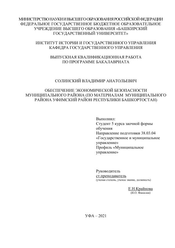 Экономика — Управление экономикой; ВКР; бакалавриат; муниципальные образования; экономическая безопасность; нормативно-правовые основы; критерии оценки