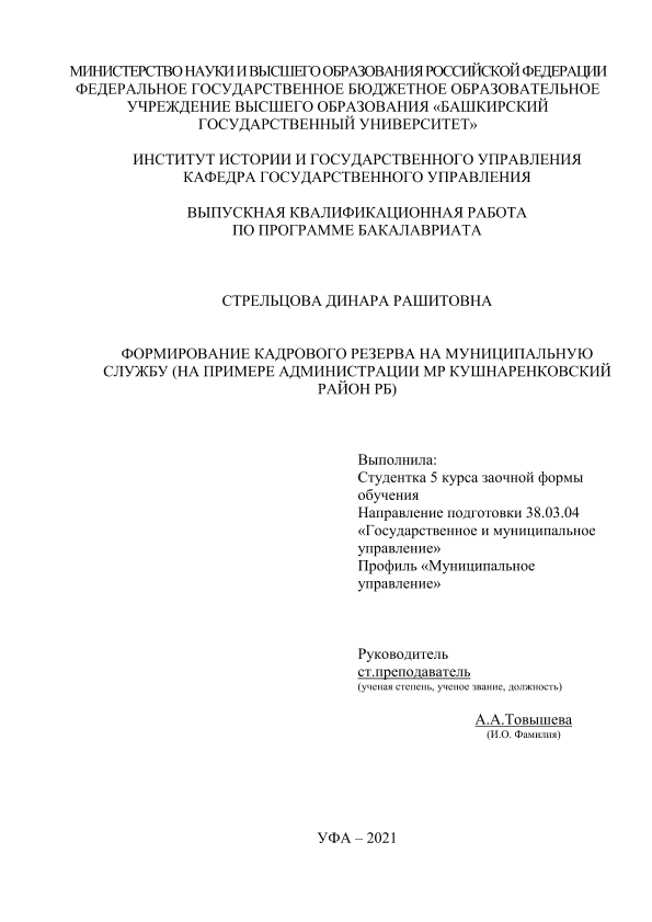 Экономика — Управление экономикой; ВКР; бакалавриат; муниципальные образования; муниципальная служба; отбор кадров; кадровый резерв