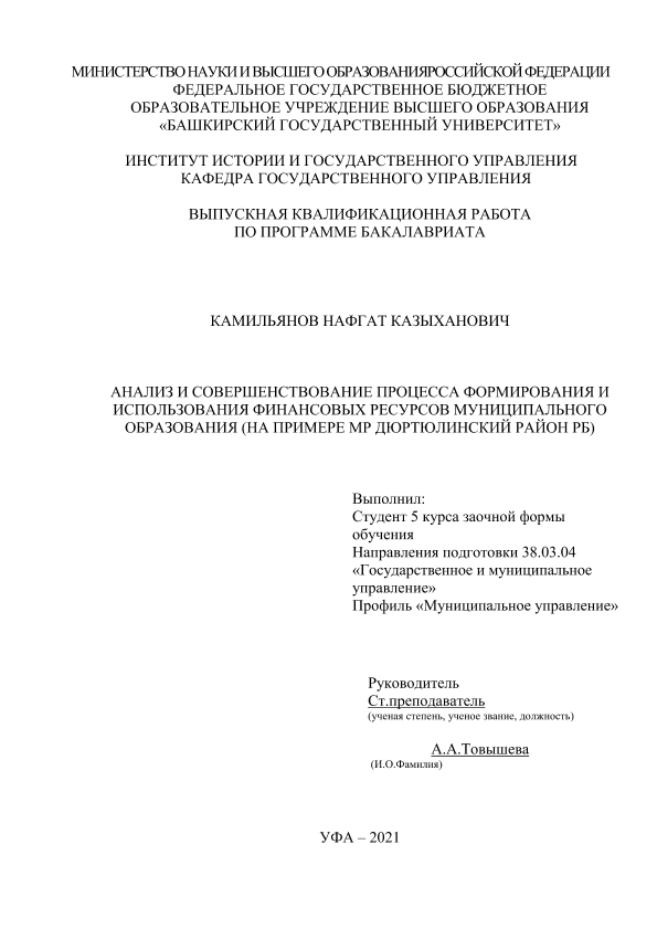 Экономика — Управление экономикой; ВКР; бакалавриат; муниципальные образования; использования финансовых ресурсов; источники формирования; Дюртюлинский район РБ