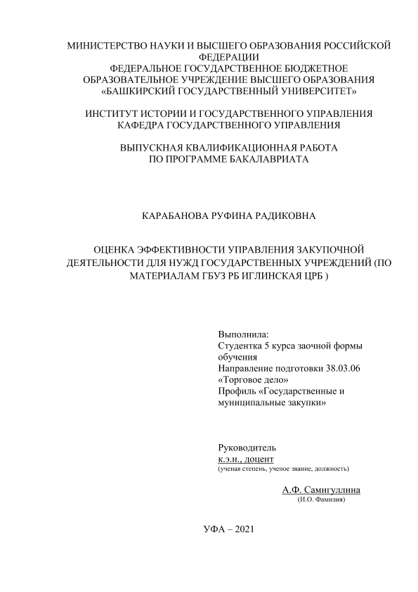 Экономика — Управление экономикой; ВКР; бакалавриат; принципы закупочной деятельности; нормативно-правовые основы управления; ГБУЗ РБ Иглинская ЦРБ; государственные учреждения