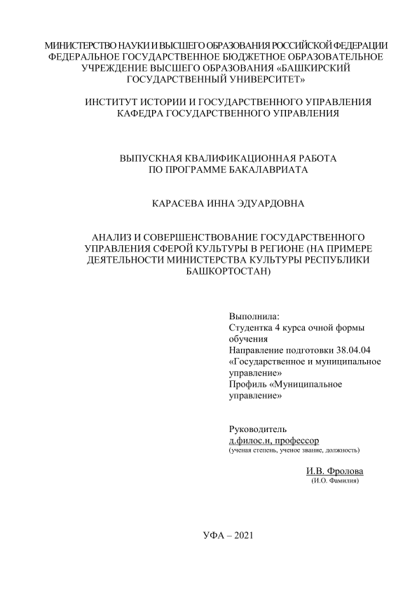 Экономика — Управление экономикой; ВКР; бакалавриат; государственное управление; деятельность Министерства культуры; организационно-управленческая характеристика; Республика Башкортостан