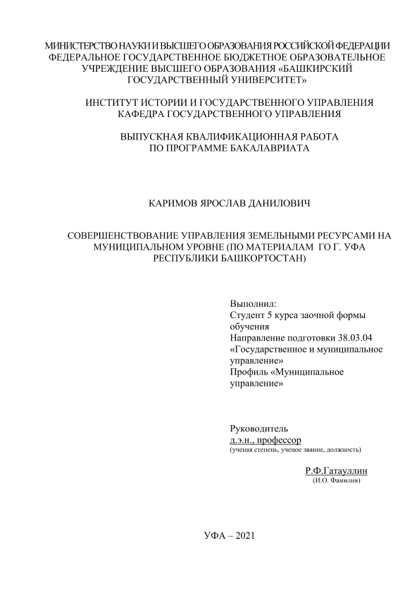 Экономика — Управление экономикой; ВКР; бакалавриат; управления земельными ресурсами; муниципальный уровень; г. Уфа; деятельность органов местного самоуправления