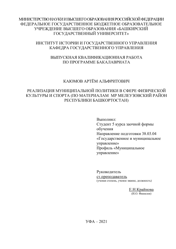 Экономика — Управление экономикой; ВКР; бакалавриат; сфера физической культуры; спорт; муниципальная политика; совершенствование реализации политики