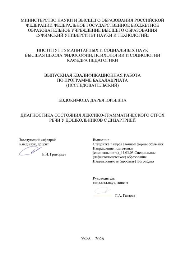 ВКР; бакалавриат; лексико-грамматический строй речи; дошкольники; дизартрия; коррекционная работа