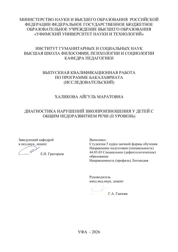 ВКР; бакалавриат; нарушения звукопроизношения; дошкольники; психолого-педагогическая характеристика; общее недоразвитие речи; комплексное диагностическое обследование