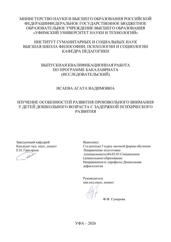 ВКР; бакалавриат; дошкольники; задержка психического развития; произвольное внимание; коррекция нарушений; развитие внимания